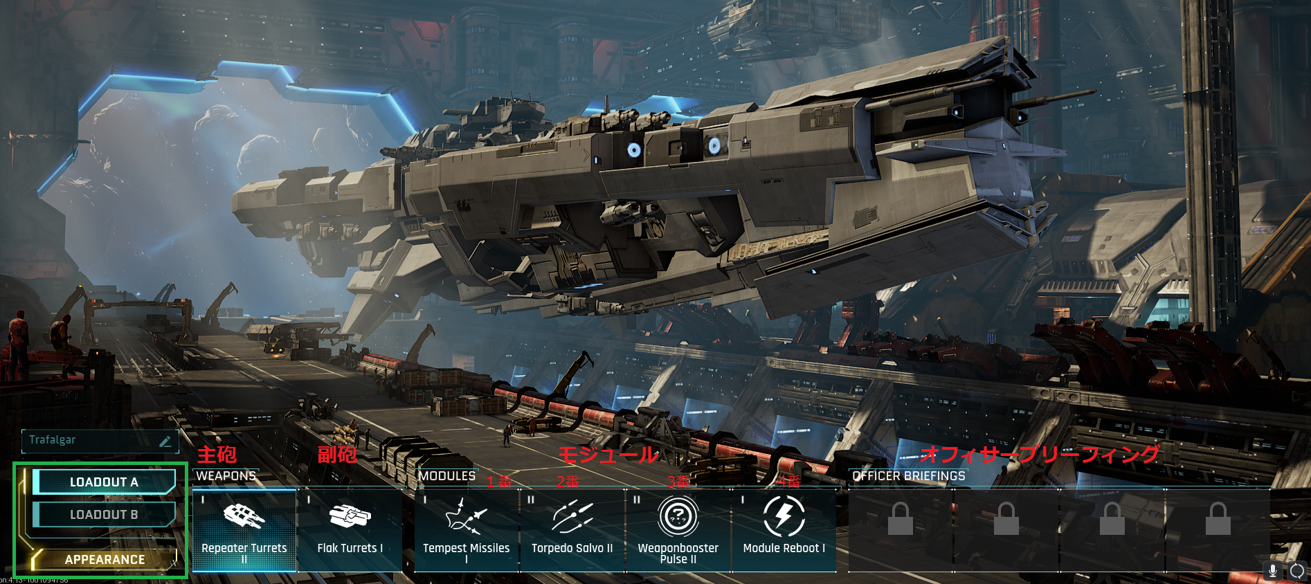 同じ艦に2種類のセッティングができる。緑枠LOADOUT A,Bのタブを選択(写真ではA)してA,B違うセッティングで登録できる。