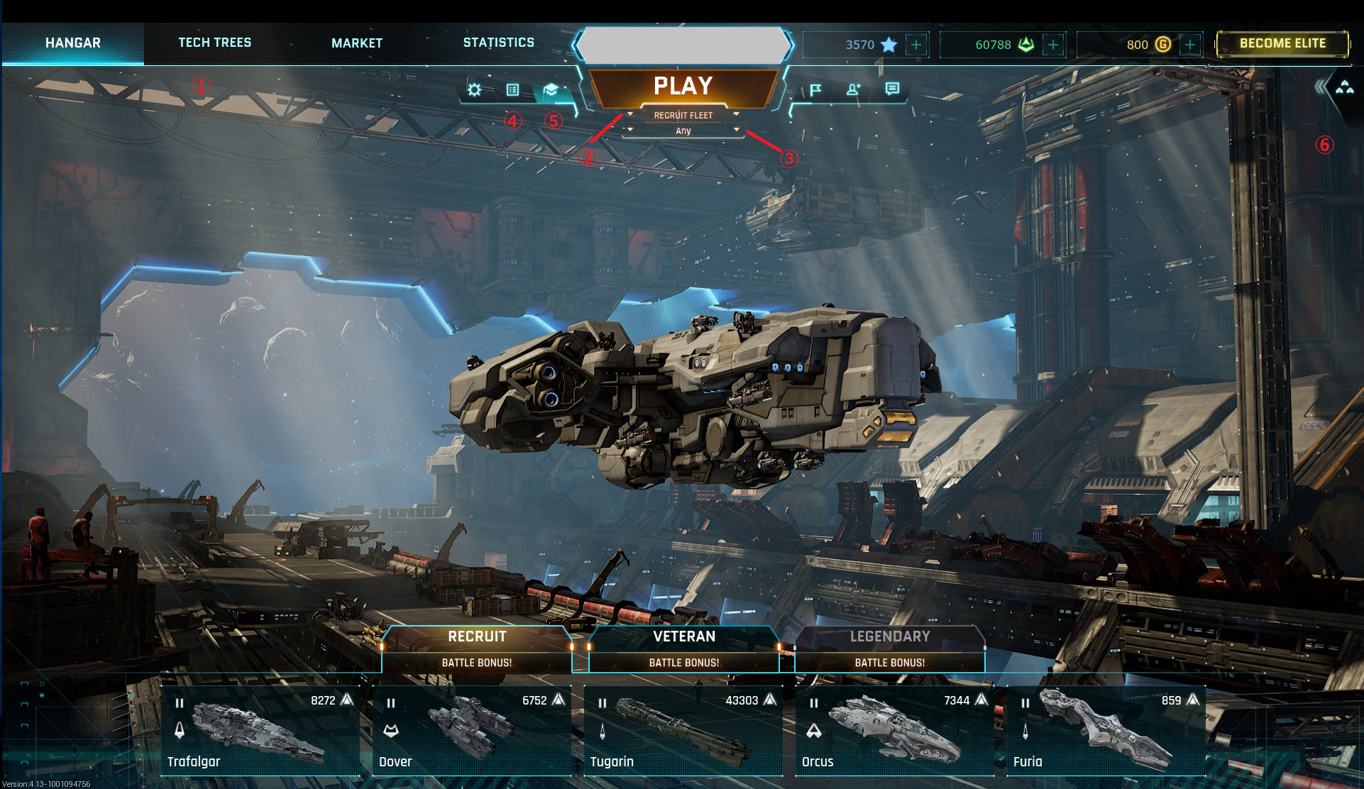 写真1下方 艦が5隻並んでいる所をロードアウトという。RECRUIT,VETERAN,LEGENDARY帯それぞれで5隻まで登録できる。